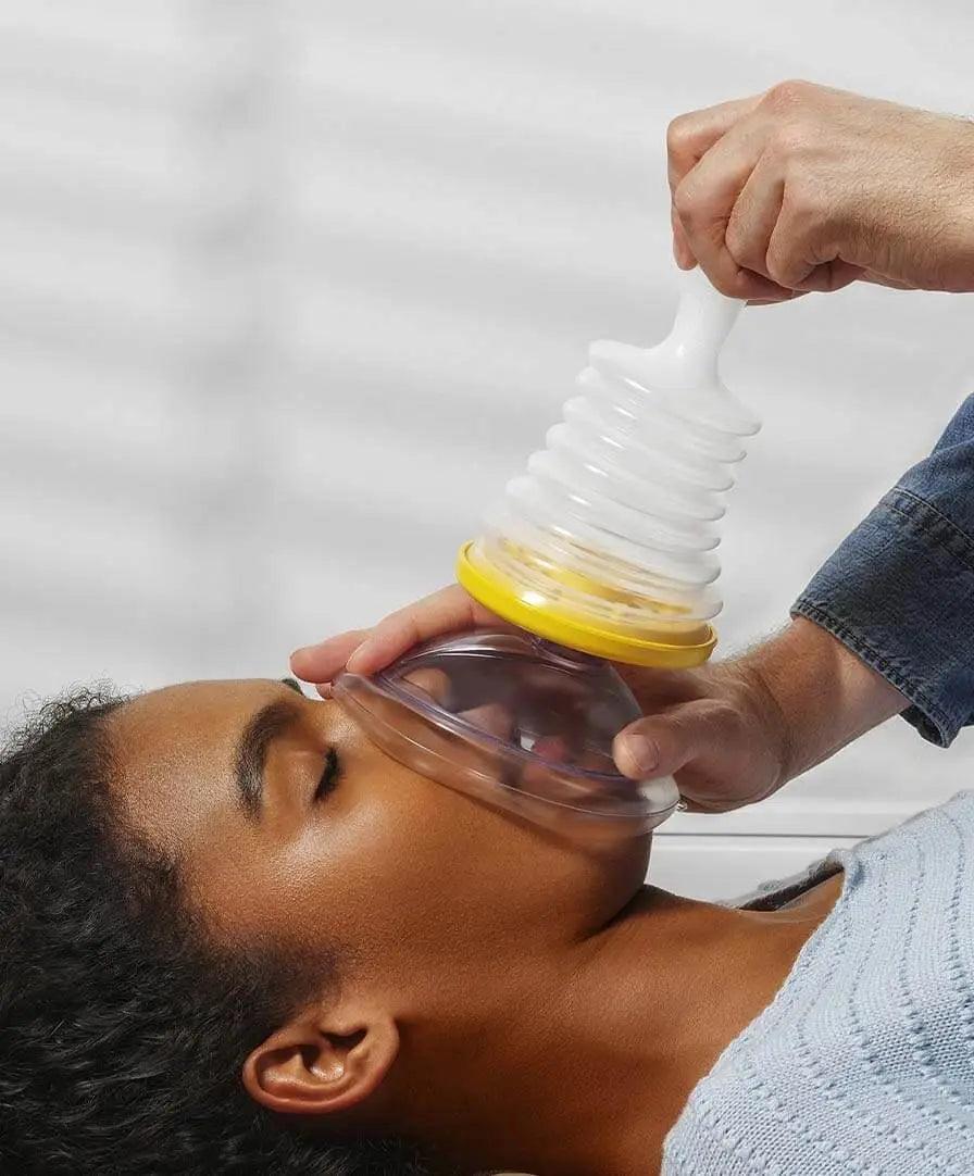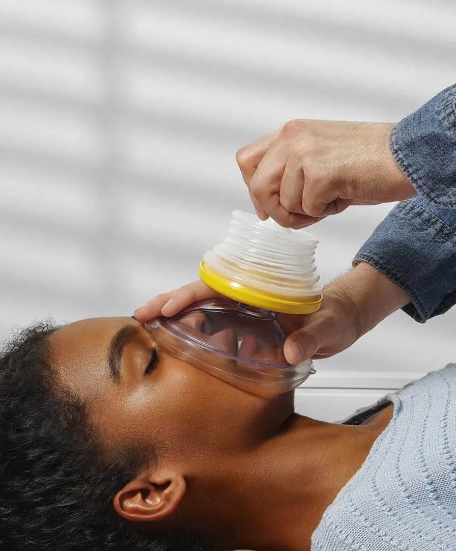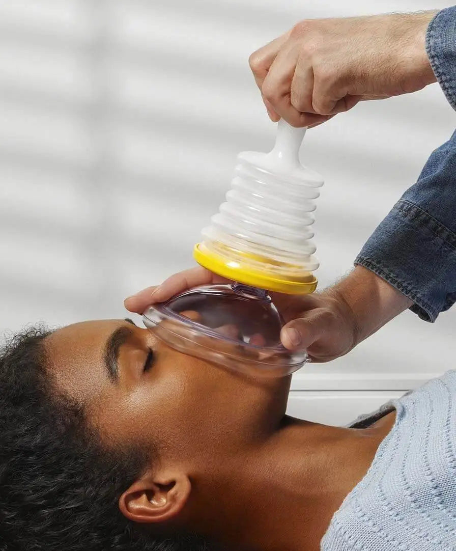 Basta posicionar a máscara sobre o nariz e a boca, pressionar o êmbolo para baixo e puxar rapidamente para cima. Esse movimento cria uma sucção que remove o alimento ou objeto preso na garganta.